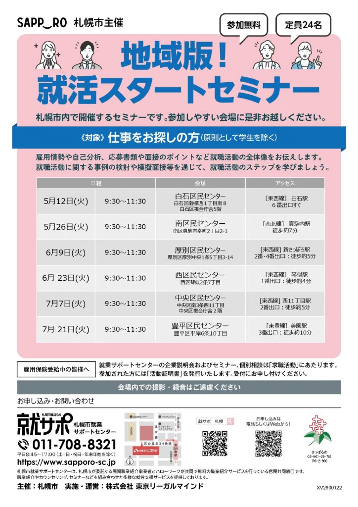 地域版!就活スタートセミナー(白石区) 現在位置の階層トップイベント案内イベント一覧地域版!就活スタートセミナー(白石区) 自己分析、応募書類や面接のポイントなど就職活動の全体像をお伝えします! 就職活動のステップを学びましょう。 セミナーに申し込む イベント詳細 日付: 2026年5月12日(火曜日) 9時30分 〜 11時30分 会場: 札幌市白石区民センター カテゴリ: 白石区 対象者: お仕事をお探しの方(学生除く)