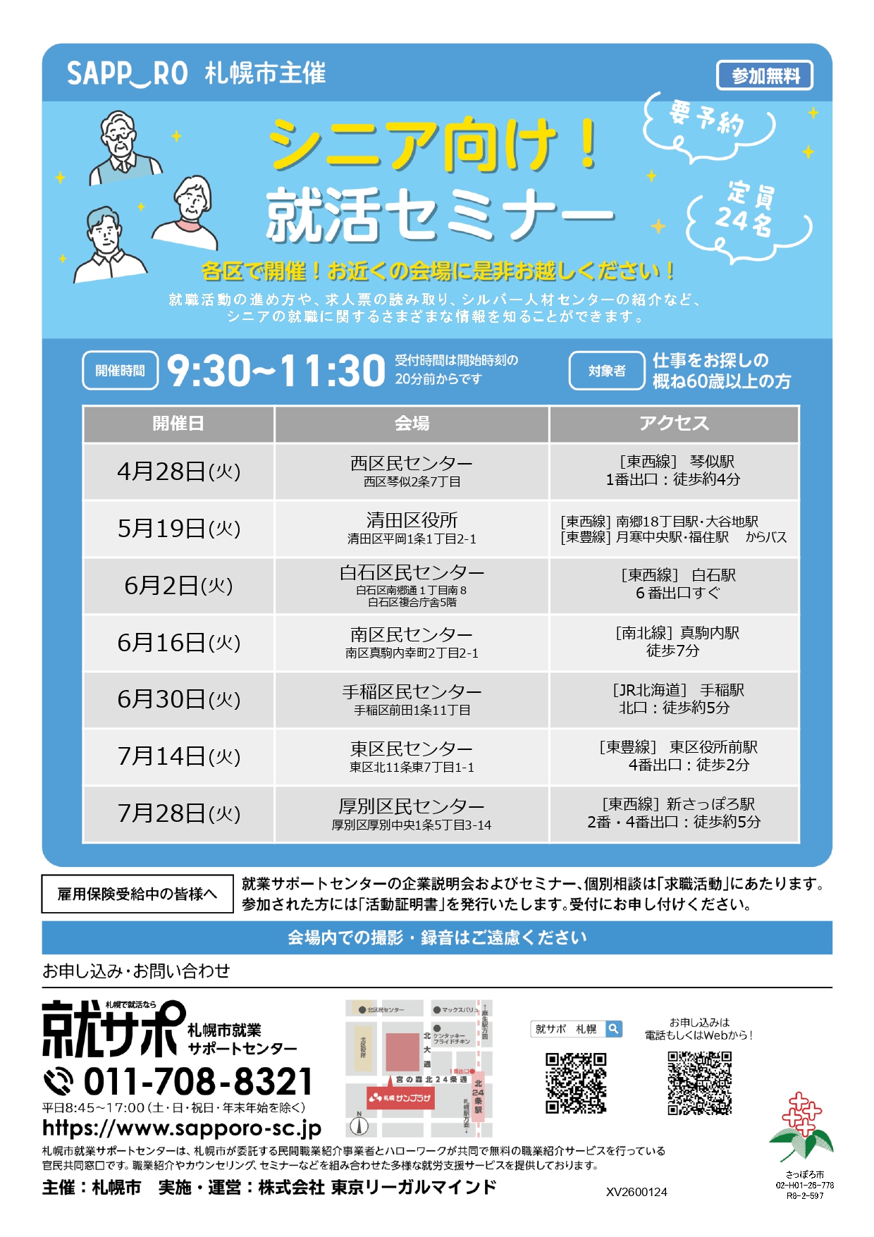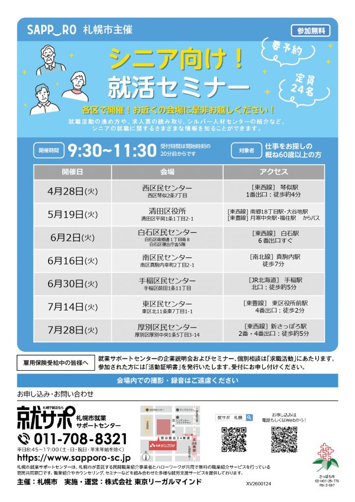 シニア向け!就活セミナー(西区) 現在位置の階層トップイベント案内イベント一覧シニア向け!就活セミナー(西区) 就職活動の進め方や実際に活躍しているシニアの方の仕事についてなど、 就職に関する最新情報を知ることができます! セミナーに申し込む イベント詳細 日付: 2026年4月28日(火曜日) 9時30分 〜 11時30分 会場: 札幌市西区民センター カテゴリ: 西区 対象者: 市内在住の60歳以上の方