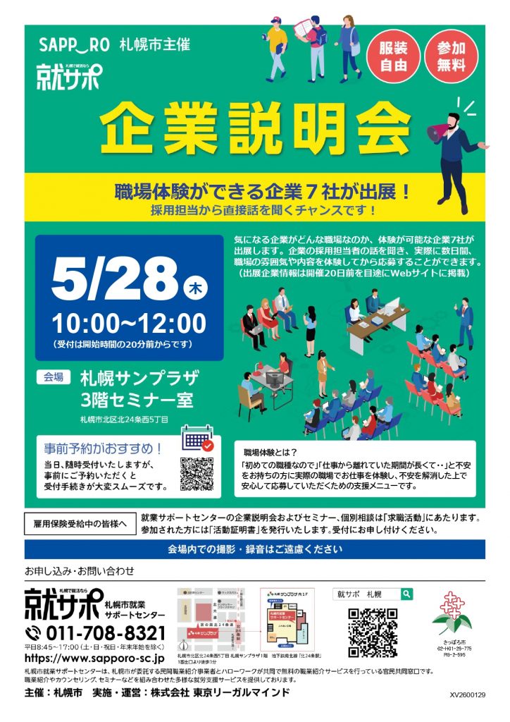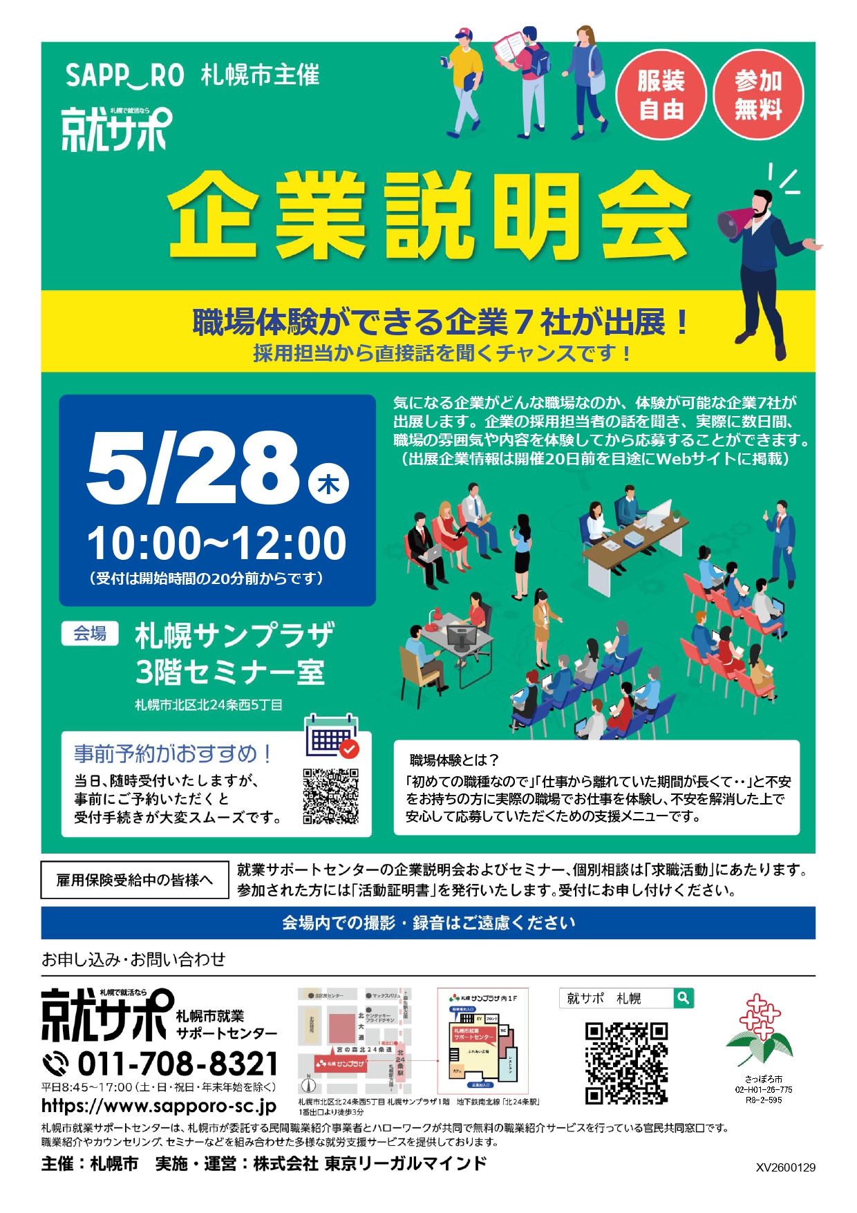 『職場体験ができる!』【テーマ別企業説明会】 現在位置の階層トップイベント案内イベント一覧『職場体験ができる!』【テーマ別企業説明会】 ☆参加料無料!☆服装自由!☆働く前に職場体験ができる企業7社が出展します。 セミナーに申し込む イベント詳細 日付: 2026年5月28日(木曜日) 10時00分 〜 12時00分 会場: 札幌サンプラザ 対象者: お仕事をお探しの方(学生除く)